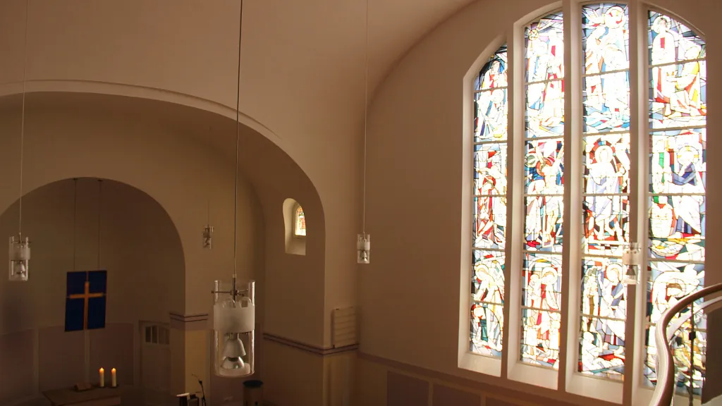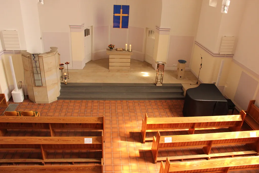 Innen fällt besonders der der säulenlose Kirchsaal auf. Die Jugendstilausmalung wurde in den sechziger Jahren des 20. Jahrhunderts unwiederbringlich übermalt. Der Altar, die Kanzel und das Taufbecken wurden durch massive Sandsteinelemente ersetzt. Ein großes Fenster mit Szenen vom Auftreten Jesu im Stil der Nachkriegsjahre wurde eingebaut.